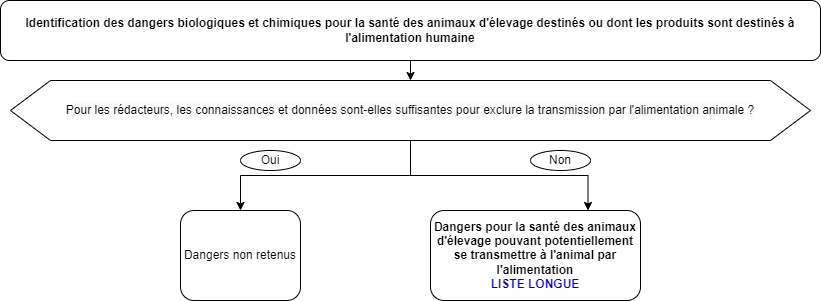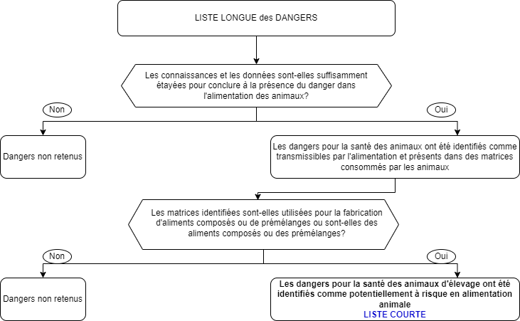 Cinq catégories de dangers biologiques associés aux aliments pour animaux ont été considérés ici : bactéries, virus, parasites, impuretés botaniques, agents transmissibles non conventionnels. Deux catégories de dangers chimiques, les mycotoxines et phytotoxines ont été arbitrairement associées aux dangers biologiques notamment en raison de leur production par des champignons ou des plantes.
