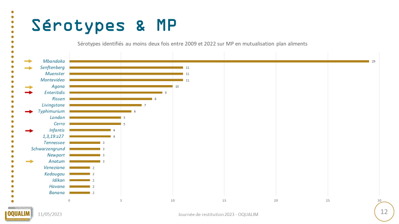 Les données du Réseau Salmonella montrent que les sérovars les plus fréquemment retrouvés dans les aliments composés destinés aux volailles (toutes filières confondues) pour la période 2009-2015, sont : S. Mbandaka (10 %), S. Anatum (10 %), S. Senftenberg (7 %), S. Agona (6 %) et S.1,3,19:z27:- (5 %).