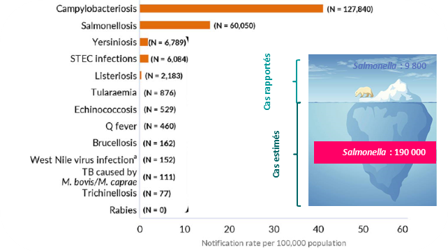 Les salmonelloses humaines non typhiques sont la deuxième maladie bactérienne d’origine alimentaire la plus fréquemment signalée en Europe, après les campylobactérioses. L’importance relative de la transmission de l’infection à Salmonella spp par la voie alimentaire est estimée à 96 %, principalement du fait de la consommation d’aliments contaminés d’origine animale, crus ou insuffisamment cuits.
