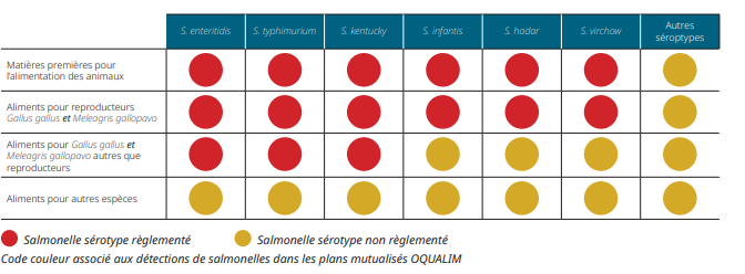 Par ailleurs, il convient de faire une différence entre les aliments destinés aux volailles « chair » et « ponte » qui peuvent être sous forme de farines, de granulés ou de miettes, et ceux destinés aux volailles reproductrices, qui, quelle que soit leur forme de présentation, sont thermisés dans des usines agréées. Les résultats obtenus par les enquêtes Oqualim, pour la période 2009-2015, ont permis la détection de S. Hadar et de S. Typhimurium dans, respectivement, un et trois échantillons d’aliments destinés aux poules pondeuses (sur 7 338 échantillons analysés). Le sérovar S. Virchow a également été mis en évidence sur un échantillon d’aliment thermisé destiné aux poules reproductrices (sur 4 560 échantillons analysés). Bien que la part des sérovars réglementés reste faible parmi l’ensemble des sérovars isolés dans les aliments pour volailles (proportion relative inférieure à 2 %), ils sont néanmoins retrouvés tout au long de la chaîne de production. Plusieurs données bibliographiques confortent cette observation, et il ressort des études que S. Typhimurium et S. Enteritidis sont les principaux sérovars identifiés à tous les maillons des filières avicoles. Cependant, seule une caractérisation des isolats par un typage moléculaire adapté permet de démontrer que l’alimentation animale est une voie d’introduction des sérovars réglementés dans les filières de production avicole. (...) L’aliment est donc une source possible, mais pas majeure, de contamination de ces filières par ces sérovars règlementés."Avis de l’Anses_Saisine n° 2016-SA-0029 _Saisine liée n° 2016-SA-0037