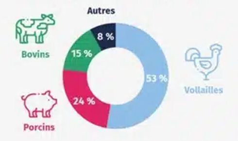 La répartition des destinations des prémélanges par espèces reflète à peu près le poids des fabrications d'aliments en France avec une priorité pour les volailles, les porcs et les bovins. Les autres espèces représentent des volumes moins importants. Infographie AFCA-CIAL, marché des prémélanges 2021, répartition par espèce (équivalent aliments reconstitués. |