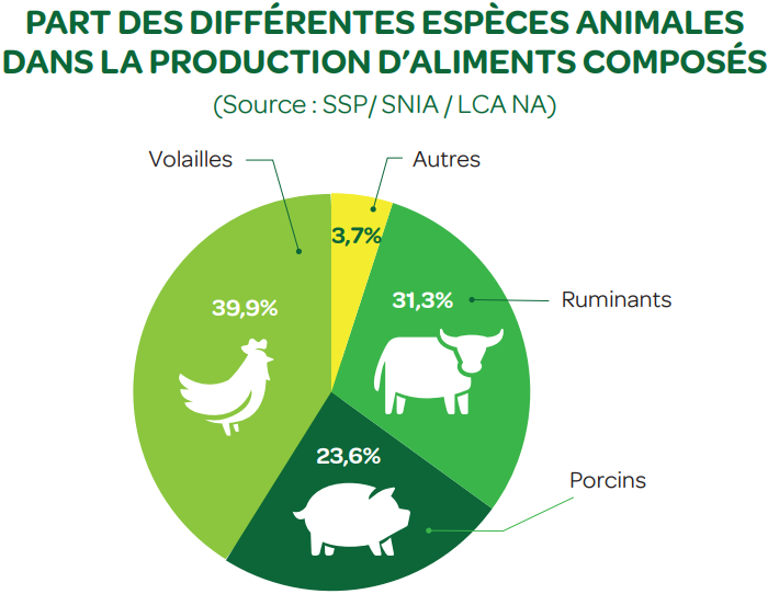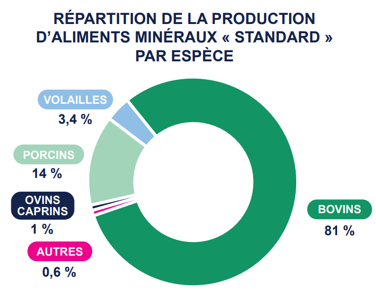Ces aliments minéraux sont principalement destinés aux ruminants (notamment bovins pour plus de 80%) et représentent la complémentation d'un volume global annuel de plus de 7 millions de tonnes de ration complète pour ces animaux. Par ailleurs, les aliments minéraux sont également commercialisés auprès d’éleveurs qui fabriquent eux-mêmes leur aliment à la ferme et contribuent à un équivalent d’environ 2 millions de tonnes d'aliments complets pour porcs et de 350 000 tonnes pour d’autres espèces (volailles notamment pondeuses). Source AFCA-CIAL_Rapport d'activité 2022 |