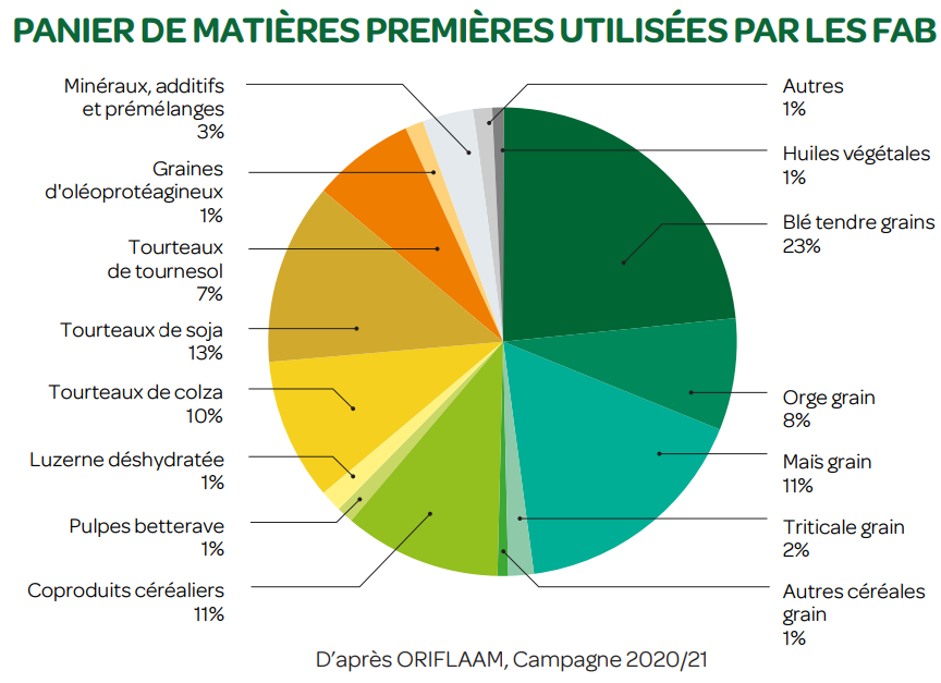Les aliments composés (complets ou complémentaires) utilisent une grande variété de matières premières.Les céréales (blé et maïs principalement) et leurs coproduits représentent un peu plus de la moitié des matières premières utilisées dans la fabrication des aliments composés. Les tourteaux d’oléo-protéagineux, coproduits issus principalement du soja et du colza, représentent plus du quart des utilisations. Globalement, les fabricants d’aliments composés valorisent de nombreux coproduits pour plus de 40% des matières premières incorporées dans leur production. |